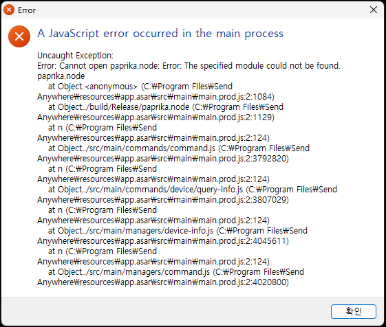- 네이티브 모듈인 `paprika.node` 파일이 손상되었거나 누락됨